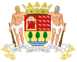 Štít dělen, nahoře polcen: 1) v červeném přirozený král na trůně se stříbrným mečem v pravici; 2) v červeném 12 zlatých děl s lafetami ve čtyřech řadách; a 3) ve zlatě tři zelené tisy na zeleném pažitu, v patě řeka s modrými a stříbrnými vlnami. Klenot: otevřená královská koruna. Štítonoši: dva diví muži a pod nimi heslo "Fidelissima bardulia nunquam superata".