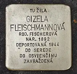 9. srpna 2015 byl před domem na Klariské ulici 7 v Bratislavě osazen tzv. Stolperstein (kámen zmizelých), tedy památný kámen pevně vsazený do chodníku před domem oběti holokaustu, věnovaný Gisi Fleischmannové.