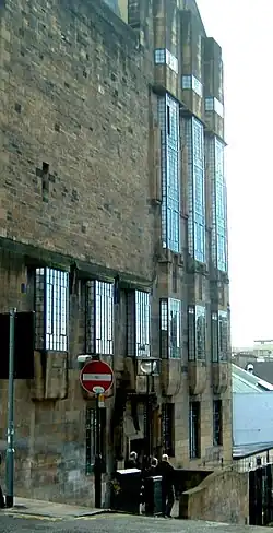Budova je syntézou srovnatelných symbolismů; různorodé vlivy zahrnují skotská baronská sídla, kontinentální Art Nouveau a směr Arts and Crafts. Tradiční japonské dekorativní motivy jsou evidentní v opracování železa v exteriérech a ve struktuře a uspořádání dřeva a ornamentů v interiérech. Kontrast a protiklad jsou pro stavbu typické. Jednou z pozoruhodností frontální fasády jsou železné stojky, které na jedné straně slouží jako opora a výztuž pro vysoká okna a na druhé jako konzolová držadla pro uchycení plošiny umývačů oken. Tyto stojky jsou ukončeny jemným krajkování opírajícím se o okno. Z nitra prostorů studií tato umělecká ukončení stojek budí dojem abstraktních železných květin zasazených do okenních květináčů. Jižní fasáda, nápadně rovná a záměrně funkcionální, je přirovnávána k pevnosti; tento dojem vytváří hrubý betonový nátěr a spřažená hmota budovy rozlomená do tří vyčnívajících křídel, s velmi hluboko vloženými a na řídce rozestavěnými okny.