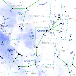 Pozice trojhvězdy vyznačená v souhvězdí Štíra červeným kroužkem. | |