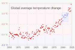 Výrazy globální oteplování, resp. změna klimatu popisují probíhající zvyšování průměrné globální teploty – a jeho dopady na klimatický systém Země. Změna klimatu v širším slova smyslu zahrnuje také předchozí dlouhodobé změny zemského klimatu. Současný nárůst průměrné globální teploty je rychlejší než předchozí změny a je způsoben především spalováním fosilních paliv lidmi.[2][3] Používání fosilních paliv, odlesňování a některé zemědělské a průmyslové postupy zvyšují množství skleníkových plynů, zejména oxidu uhličitého a methanu.[4] Skleníkové plyny pohlcují část tepla, které Země vyzařuje po ohřátí ze slunečního záření. Větší množství těchto plynů zachycuje více tepla ve spodních vrstvách zemské atmosféry, což způsobuje globální oteplování.[5]