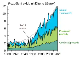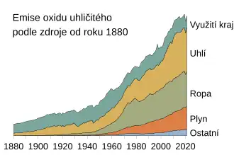 Projekt Global Carbon Project ukazuje, že přírůstky CO2 od roku 1880 byly způsobeny různými zdroji, které všechny rostly.