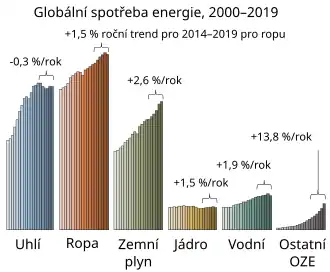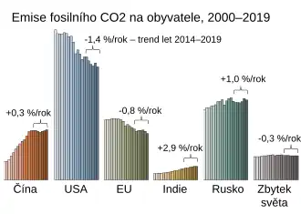 Lidská činnost od průmyslové revoluce, především těžba a spalování fosilních paliv (uhlí, ropy a zemního plynu),[92] zvýšila množství skleníkových plynů v atmosféře, což vedlo k radiační nerovnováze. V roce 2019 se koncentrace CO2 a methanu od roku 1750 zvýšily přibližně o 48 %, respektive o 160 %.[93] Hodnoty koncentrací CO2 v ovzduší jsou vyšší než kdykoli v průběhu posledních 2 milionů let. Také koncentrace methanu jsou mnohem vyšší, než byly za posledních 800 000 let.[94]
