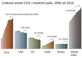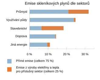 Celosvětové antropogenní emise skleníkových plynů v roce 2018, s výjimkou emisí způsobených změnami ve využívání půdy, odpovídaly 52 miliardám tun CO2. Z těchto emisí tvořil 72 % CO2, 19 % methan, 6 % oxid dusný a 3 % fluorované plyny.[95] Přibližně 72 % emisí CO2 pochází ze spalování fosilních paliv, která zajišťují energii pro dopravu, výrobu, vytápění a výrobu elektřiny.[4] Další emise CO2 pocházejí z odlesňování a z průmyslových procesů, které zahrnují CO2 uvolňovaný chemickými reakcemi při výrobě cementu, oceli, hliníku a hnojiv.[96] Emise methanu pocházejí z chovu hospodářských zvířat, z hnoje, z pěstování rýže, ze skládek, z odpadních vod a z těžby uhlí, ropy a zemního plynu.[97] Emise oxidu dusného pocházejí z velké části z mikrobiálního rozkladu anorganických a organických hnojiv.[98] Z hlediska výroby se odhaduje, že hlavními zdroji globálních emisí skleníkových plynů jsou: elektřina a teplo (25 %), zemědělství a lesnictví (24 %), průmysl a výroba (21 %), doprava (14 %) a budovy (6 %).[99]