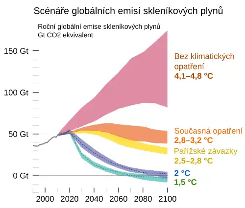 Potenciální budoucí scénáře globálních emisí skleníkových plynů. Pokud všechny země splní své současné přísliby stanovené v pařížské dohodě o klimatu, průměrné oteplování do roku 2100 překročí cíl pařížské dohody, aby se oteplování udržovalo „výrazně pod 2 °C“.