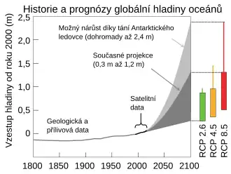 Globální hladina moří se zvyšuje v důsledku tání ledovců, tání ledového příkrovu Grónska a Antarktidy a teplotní expanze oteplující se vody v oceánech. Mezi lety 1993–2020 se vzestup v čase zvyšoval a činil v průměru 3,3 ± 0,3 mm ročně.[173] V průběhu 21. století by podle odhadů IPCC mohla hladina moří při scénáři s velmi vysokými emisemi stoupnout o 61–110 cm.[174] Zvýšené oteplení oceánů hrozí odtržením splazů antarktických ledovců, což představuje riziko dalšího rozsáhlého tání ledovců[175] a možnost až dvoumetrového vzestupu hladiny moří do roku 2100 při vysokých emisích.[176]