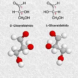 Glyceraldehyd obsahuje jednu aldehydickou skupinu a dvě skupiny hydroxylové. Prostřední uhlík (druhý uhlík) vytváří chirální centrum, a proto existuje glyceraldehyd ve dvou různých enantiomerech s opačnou optickou rotací. Tyto dvě molekuly se chovají jako své zrcadlové obrazy. Podle Fischerovy projekce jsou označovány jako D-glyceraldehyd (otáčí lineárně polarizované světlo doprava) a L-glyceraldehyd (otáčí lineárně polarizované světlo doleva).