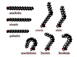 Glycerol má tři hydroxylové funkční skupiny, které lze esterifikovat s jednou, dvěma nebo třemi mastnými kyselinami za vzniku mono-, di- a triglyceridů.[2] Tyto struktury se liší alkylovými skupinami mastných kyselin, protože mohou obsahovat různý počet uhlíků, různé stupně nenasycení a různé konfigurace a polohy alkenů.[1]