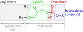 - Fosfátová skupina připojená ke třetímu uhlíku molekuly glycerolu tvoří polární hydrofilní hlavu molekuly.
