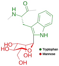 - C-vázané glykany připojené na uhlík. Je to vzácná forma glykosylace, kdy se sacharid váže k uhlíku na postranním řetězci tryptofanu. Příkladem je glykosid aloin, který je jednou z mála přirozeně se vyskytujících látek. Nachází se v rostlině Aloe vera.