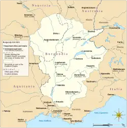 - ↑ a b c FAVROD, Justin. Les Burgondes: un royaume oublié au coeur de l'Europe. [s.l.]: Collection le savoir suisse 142 s. Dostupné online. ISBN 978-2-88074-596-7. S. 74. (francouzsky)