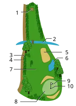 Golfové hřiště se obvykle skládá z 18 jamek a typická délka hřiště je kolem 6 km.[7][8] Častá jsou však i 9jamková hřiště – ta je pak pro plnou hru možné hrát dvakrát za sebou. Výraz jamka se kromě samotné prohlubně, do které se má míček dostat, používá i pro část hřiště od daného odpaliště až k jemu příslušnému jamkovišti (greenu), na kterém je vyvrtána vlastní jamka. Většina jamek má green od odpaliště příliš daleko na to, aby se dal zasáhnout první ranou, proto je mezi greenem a odpalištěm nízko sekaný pruh zvaný dráha (fairway), po kterém hráč postupuje k jamce. Mezi fairwayí a greenem je tzv. foregreen, tráva sekaná mírně výše než green. Nesekaná tráva okolo fairwaye se nazývá rough a tvoří další překážku. Z důvodu urychlení hry (např. díky snadnějšímu hledání míčku) se většinou tráva bezprostředně vedle ferveje seká na výšku semirough, tj. o něco výše než fairway, ale níž než rough.