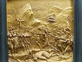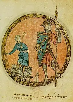 Vláda krále Saula už byla za vrcholem, když se pelištejské a izraelské vojsko utábořilo proti sobě a obr Goliáš z Gatu každý den děsil Izraelce tím, že vyzýval někoho z nich na souboj. Goliáš měl prý měřit 10 stop a jeho výzbroj se v knize popisuje jako výzbroj řeckého těžkooděnce, jen mnohonásobně větší.[3] Když Davidovi starší bratři odešli do boje, vrátil se David pást stáda svého otce. Když se ale otec doslechl, v jaké nouzi je Saul, poslal Davida s chleby a sýrem zpátky k jeho vojsku. Malému Davidovi se tam všichni smáli, ten se však ohradil a nakonec si ho zavolal sám král. David mu řekl, že Goliáše s pomocí Hospodinovou přemůže a zabije. Král o tom nejdříve nechtěl ani slyšet, pak mu oblékl své brnění, ale David v něm nedokázal chodit, a tak vystoupil proti Goliášovi jako pasáček s torbou s oblázky a s prakem v ruce. Goliáš se mu ovšem posmíval, David ho však trefil kamenem do čela a na místě byl Goliáš zabit.
