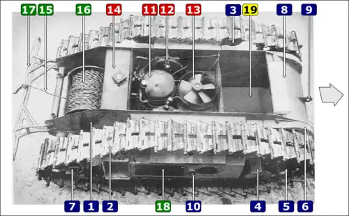 Spalovací motor (11) byl umístěn ve střední části rámu a byl společný pro oba pojezdové pásy. Kroutící moment motoru byl přes dvě spojky (12) a převody rozváděn k rozetám pro pohon pásů. Motor byl vybaven nuceným chlazením, které zajišťoval ventilátor (13), umístěný před motorem. Palivová nádrž (14) s horním plnicím otvorem byla umístěna za motorem. V horní části rámu byla umístěna nízká nástavba pro přívod vzduchu (není zobrazena).