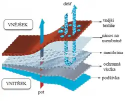 • Póry v membráně jsou asi 700 x větší než molekula vodních pár. Lidský pot proto může (při okolních nízkých a středních temperaturách) procházet membránou a vypařovat se.[3]