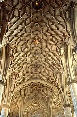 Propracovaná vějířovitá klenba v křížové chodbě katedrály v Gloucestru