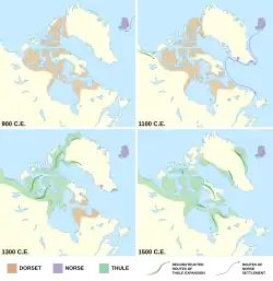 Po roce 1300 lidé kultury Thule kulturně i geneticky nahradili původní paleo-eskymácké obyvatelstvo z dorsetské kultury,[45] které na americký kontinent přišlo ze severovýchodní Sibiře před asi 6000 lety.[46] Obyvatelé kultury Thule se pravděpodobně dostávali do konfliktu se severskými osadníky, protože islandské letopisy uvádějí, že v roce 1379 zaútočili Inuité na skupinu skandinávských Gróňanů, zabili 18 mužů a unesli dva chlapce a ženu.[47]