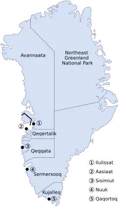 Všechna města a osady Grónska se nacházejí na pobřeží v místech, kde není zalednění, přičemž obyvatelstvo je soustředěno podél západního pobřeží. Severovýchodní část Grónska není součástí žádné obce, ale nachází se zde největší národní park na světě, Národní park Severovýchodní Grónsko.[82]