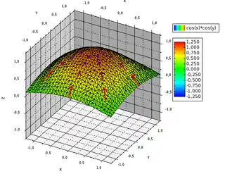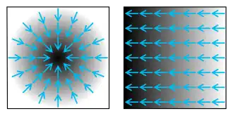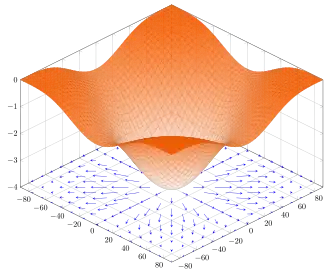 Ukázka gradientu (modré vektory) pro dvě různá skalární pole (černá představuje vyšší hodnotu skalární funkce).Gradient funkce f(x,y) = −(cos2x + cos2y)2 v trojrozměrném prostoru – nejdelší šipky značí největší růst, kratší šipky pomalejší.Gradient na 3D povrchu – červená šipka značí největší růst, modrá pomalejší, na vrcholu je růst i gradient nulový.