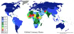 80 % dospělých na světě je gramotných. Nejvyšší gramotnost vykazuje Evropa, Severní Amerika a Austrálie, nižší pak země jižní Asie (59,5 %), subsaharské Afriky (60,3 %) a arabské státy (70,3 %). Protože mezinárodní společenství si klade za cíl, aby v budoucnu byli všichni lidé na světě gramotní, je jedním z Rozvojových cílů tisíciletí zajistit základní vzdělání pro všechny děti na světě do roku 2015. To se však zřejmě nepodaří splnit, i když situace se oproti minulosti zlepšila. Nejnižší gramotnost, 53 %, má skupina nejméně rozvinutých zemí.