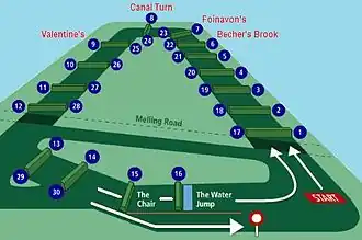 Od založení dostihů se překážky v Aintree několikrát měnily, ale za sto let se nezměnily ani rozměry živých plotů a šířky příkopů. V současnosti mají dostihy délku 7216 m a běží se po travnatém povrchu dráhy, na kterém je 16 překážek, z nichž nejznámější je Becher's Brook. Čas vítězů se po prvé začal měřit v roce 1839 (14:53,00 min), ale měnil se podle změn délky tratě a kurzu dostihů. Prvním vítězem, který dosáhl čas pod deset minut, byl v roku 1850 polokrevný valach Abd-el-Kader, který doběhl do cíle v čase 9:57,5 min. (při délce tratě 6805 m). Po ustálení délky dostihů na současných 7216,20 m traťový rekord v roku 1973 vytvořil fenomenální ryšavý steepler Red Rum s žokejem Brianem Fletcherem s časem 9:01,90 min. Ten až v roku 1990 překonal Mr. Frisk s amatérem Markusem Armytageem, který trať jako první přecválal za 8:47,8 min.