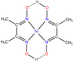 - Ni2+ (aq) + 2 NH3 (aq) + 2 C4H8N2O2 (aq) → Ni(C4H7N2O2)2 (s) + 2 NH4+ (aq)