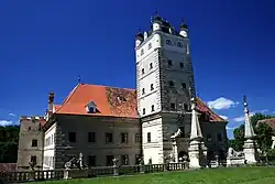 Mezi lety 1700 až 1720 vznikla v zámeckém areálu obora, objekt byl doplněn o barokní vodotrysk se sochou draka chrlícího vodu a 24 soškami trpaslíků; byla též vybudována nová příjezdová cesta. Ve dvoře bylo postaveno několik barokních váz podle návrhů Johnna Fischera z Erlachu (1656–1723). Vnitřní vybavení se většinou zachovalo v originálním stavu a bylo částečně doplněno.