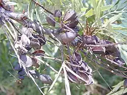 Plod je suchý, bočně stlačený, pukavý měchýřek dlouhý 2 cm, který obsahuje dvě hnědá, křídlatá semena. Ta jsou dlouhá 13 až 19 mm, široká 9 mm a tlustá 0,9 mm, jejich centrální vejčité tělo je obklopeno okrouhlým papírovitým křídlem. Otevírání tobolek se semeny stimuluje sucho a teplo, asi sto tisíc semen váží 1 kg.[2][4][6][7][8]
