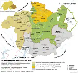 V roce 1797 připadla poddanská území v prostoru dnešního Graubündenu Cisalpinské republice. V letech 1799/1800 se zbývající území stalo součástí Helvétské republiky jako kanton Rhaetia a v roce 1803 se stalo součástí Švýcarska jako kanton Graubünden.