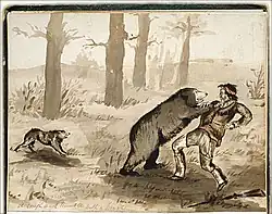 Hugh Glass napadený medvědem grizzlym, z rané novinové ilustrace neznámého původu.