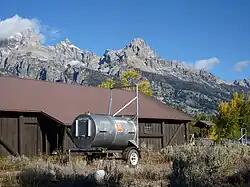 Bubnová, nebo také sudová past, která se používá k bezpečnému přemísťování medvědů, vedle budovy v národním parku Grand Teton ve Wyomingu, USA.