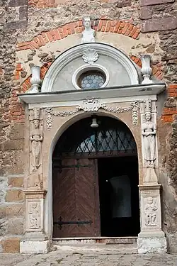 ![]() Pohled ke vstupnímu čelu horního hradu; vpravo pod hlavní věží vyčnívá střecha předsunuté (regotizované) brány. | |
