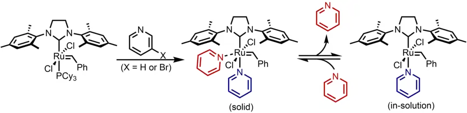 Katalyzátor se obvykle izoluje jako dvoupyridinový komplex, jeden pyridin se však ztrácí při rozpouštění a vratně inhibuje rutheniové centrum.