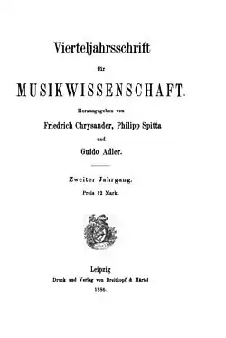 Spolu s Friedrichem Chrysanderem zakládal a řídil hudebněvědné periodikum Vierteljahrschrift für Musikwissenschaft. Slavná je Adlerova úvodní stať v prvém čísle časopisu nazvaná Umfang, Methode und Ziel der Musikwissenschaft, v níž hudební vědu rozdělil na historickou a systematickou.