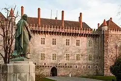 Středověký palác vévodů z Bragancy se sochou krále Alonsa I. (1887)