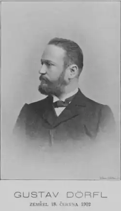 - ↑ a b c d e Dörfl Gustav †. Národní politika. 1902-06-18, roč. 20, čís. 166, s. 2. [Národní knihovna České republiky Dostupné online] [cit. 2012-01-09].
