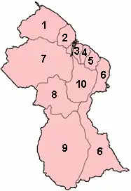 Guyana se dělí na deset regionů. Každý region je spravován regionální demokratickou radou (Regional Democratic Council, RDC)[8][9]