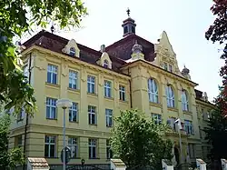 V roce 1901 vyhlásilo město Žatec veřejnou soutěž na stavbu nové gymnaziální budovy. V porotě zasedal mj. architekt Národního divadla Josef Zítek. Zvítězil projekt libereckého stavitele Ernesta Schäfera. V prosinci 1903 byla nová budova, ve které sídlí gymnázium doposud, slavnostně otevřena.[13] Budova žateckého gymnázia tvoří jednu z pohledových dominant města. Je to architektonické dílo, které svou hodnotou převýšilo úroveň ostatních staveb vznikajících v té době ve městě.[14]
