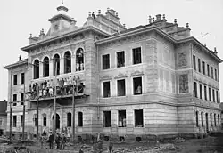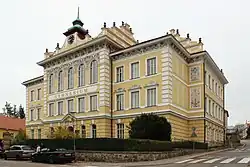 Současná novorenesanční budova vznikla během období rozvoje města na přelomu 19. a 20. století; budována byla v letech 1896 až 1899.[3] Jejím architektem byl Robert Příhoda, v některých částech se inspiroval nepochybně budovou Plzeňské radnice (střešní štít) apod. Během stavebních prací se zde zřítilo lešení a zabilo jednu ženu a několik dělníků.