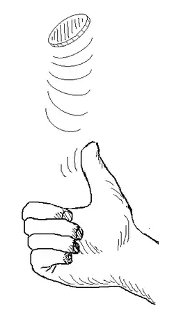 Realizuje se tak, že každé ze stran mince je přidělena jedna z možností a poté je mince vyhozena do výšky tak, aby se přitom otáčela a bylo lidskými smysly víceméně nemožné odhadnout, jakou ze svých stran dopadne na zem, zda aversem nebo reversem, tedy jaká možnost skončí nahoře a tedy bude vybrána. Někdy je zvykem nechat minci dopadnout až na zem, jindy je zvykem ji chytit ještě ze vzduchu a přeplácnout na hřbet druhé ruky.