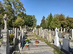 - Východní části hřbitova dominuje rozměrná hrobka Jakuba Lišky s trojúhelníkovým tympanonem neseným sloupy a se sochou Piety uvnitř.[3]