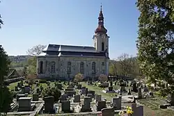 Hřbitov se rozkládá na úpatí Farského vrchu, je terasovitý a má půdorys nepravidelného obdélníka. Na jihu jej ohraničuje stavba místního farního kostela sv. Petra a Pavla, z východní strany pak zahrada místní fary. Ve středu severní ohradní zdi se nachází novorenesanční kaplová hrobka rodiny Hellmichovy. Na hřbitově je několik pozoruhodných náhrobků, z nichž nejvýraznější je hrob rodiny Hilbertovy, na němž je socha lesníka téměř v životní velikosti. V západní ohradní zdi hřbitova je přízemní barokní márnice.