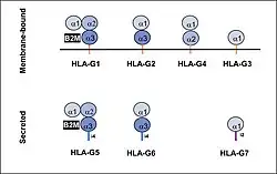 Oproti klasickým HLA molekulám, gen pro HLA-G má pouze 46 alel. Alternativním splicingem může být vytvořeno 7 různě dlouhých isoforem HLA-G.[2] Isoforma HLA-G1 se nejvíce podobá klasickým MHC I. Skládá se z těžkého řetězce složeného z α1, α2 a α3 podjednotky, který je zakotven v plazmatické membráně, a lehkého řetězce tvořeného β2 mikroglobulinem. Isoforma HLA-G2 se skládá pouze z podjednotek α1 a α3, HLA-G3 z α1 a HLA-G4 z α1 a α2. HLA-G5, G6 a G7 strukturně odpovídají HLA-G1, G2 a G3, ovšem postrádají transmembránovou část molekuly a jsou tedy solubilní (rozpustné).[3] Existuje i solubilní forma HLA-G1 vzniklá odštěpením glykoproteinu z membrány proteázami. Pouze HLA-G1 a G5 jsou schopny vázat na sebe peptidy. Navíc mohou tvořit i dimery či tetramery, které mají vyšší afinitu k receptorům rozeznávajícím HLA-G. HLA-G1 a G5 jsou buňkami exprimovány nejvíce.[4] Exprese sekrečních HLA-G byla pozorována při zvýšených hladinách interferonu γ a interleukinu 10.[5]