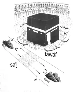 Po rituálu obcházení Ka'by se poutníci dvakrát pomodlí čelem k místu mezi vchodem Ka'by a Černým kamenem, které se nazývá multazam, a pijí vodu z pramene Zamzam.[33] Poté následuje běh či chůze mezi pahorky Safá a Marwá, které jsou od sebe vzdáleny asi 700 metrů. Během putování mezi pahorky muslimové nahlas pronášejí verše koránu. Tento úkon, který se nazývá sa'j, symbolizuje Hádžařino zmatené běhání pouští, během kterého se snažila najít vodu pro svého syna Ismá'íla.[34] Po skončení těchto rituálů se většina poutníků odebere do údolí Miná, kde přečká noc v bílých stanech.