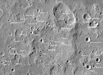 Jihovýchodně sousedí s Hainzelem rozpadlý kráter Mee a východně leží kráter Epimenides.