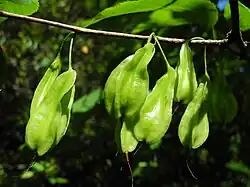 Plody vznikající z hmyzem, hlavně včelami, opylených květů. Jsou to svěšené peckovice elipsoidního tvaru se čtyřmi stejnými podélnými úzkými a mírně korkovitými křídly, bývají dlouhé 2,5 až 5 cm, široké 1 až 2,5 cm a mají zřetelný zobáček. Hnědá, po spadu pukající peckovice obsahuje pouze jedno semeno vřetenovitého tvaru vybavené hojným endospermem.[2][3][6][7][8]