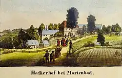 22. března 1665 dvůr odkoupil tepelský klášter a po požáru jej dal opat kláštera Raymund I. Wilfert znovu vystavět jako Hammerhof, tj. Hamerský dvůr, Když v roce 1706 stavba znovu vyhořela, stavitel Kryštof Dientzenhofer nechal postavit v jihovýchodním cípu dvora zámeček a po dokončení stavby v roce 1708 získal přední trakt dvora název Villa Hammerhoviana.[2]