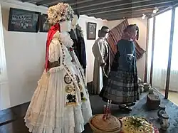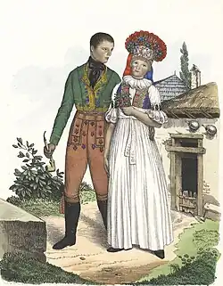 Nepřehlédnutelný prvek ženského svatebního kroje představovala honosná pokrývka hlavy, pro kterou se vžilo označení pantlék.[77] Tato nevěstina koruna byla tvořena obručí a lepenkovou kostrou, jež zdobily korálky, flitry a kytice většinou zřejmě umělých růží. Na vrchol koruny býval umístěn samotný pantlék, tedy věnec červených mašlí, z nichž dozadu visely červené stuhy.[77] Dalším ze svatebních doplňků nevěstina kroje byla vyšívaná přehozová plachta známá jako úvodnice, kterou si dívka během svatebního obřadu přehazovala přes lokty. Po narození dítěte pak v úvodnici brala matka do kostela své novorozeně.[77] Ženich měl na hlavě klobouk bohatě zdobený pentlemi, umělými květinami a péry. Jeho kroj pak při svatbě doplňoval červený lipský šátek, který mu byl přivazován od pravého ramene k levé kyčli.[81] Součástí svatebních zvyků bylo i předávání svatebních darů. Nevěsta často ještě před obřadem posílala svému nastávajícímu vyšívanou tenčici nebo šátek. Ženich pak obdarovával svou nevěstu stříbrnými mincemi, které jí kladl do klína, nebo střevíci, jimž se říkalo poslušné.[82] Po svatební hostině následovalo čepení nevěsty. Během tohoto rituálu odstranily provdané ženy nevěstě její zdobnou pokrývku hlavy a zapletly její vlasy okolo hlavy. Dívka obdarovaná čepcem, tak byla uvedena mezi dospělé ženy. Ženich směl po svatbě poprvé obléknout plášť a nevěsta z jeho klobouku "otrhala" pentle a další ozdoby.[77] Mezi zvyky spojené se svatbou patřilo také rozšířené stínání kohouta, který byl po hostině souzen a zabit pro své údajné hříchy.[83]