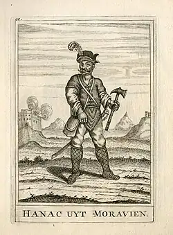 Součástí mužského kroje byla dlouhá konopná nebo bavlněná košile tenčice zdobená hnědočernou výšivkou límečku u krku a krémovou až žlutou výšivkou na rameni.[37] Košile bývala doplněna červenou nebo černou stužkou a někdy též černým šátkem ovázaným okolo krku.[38] Kalhoty gatě, které původně sahaly pouze po kolena, kde se uvazovaly zdobenými řemínky, bývaly zhotovovány z konopného plátna nebo z ovčích či kozích kůží a výjimečně též z jelenice. Doklady z 80. let 18. století hovoří o žluté barvě těchto kalhot, avšak od 19. století se charakteristickým znakem hanáckého kroje staly gatě cihlově červené či hnědočervené.[38] Přesto se však žlutá barva kalhot v některých částech regionu zachovala a například historik Beda Dudík dělil Hanáky dle barvy jejich kalhot na žluté a červené.[39] Přes košili bývala nošena vesta zdobená výšivkou s florálními a geometrickými motivy označována jako frydka, lajdík nebo kordula.[40][41] Na západě a jihovýchodě Hané se zeleně lemovaná vesta šila z černého sukna, na východě z modrého lemovaného červenou nebo bílou a především na jihu se objevuje vesta ušitá ze sukna zelené a občas i hnědé barvy.[40] Součástí mužského oděvu byl i kabátek marinka nebo po kolena dlouhý černý či bílý kabát zvaný ketla či plátynka.[42] V zimě nosili muži bílý či žlutý kožich z ovčí nebo beraní kožešiny, který byl znám jako tzv. ocáskový kožich. Tuto část oblečení však na přelomu 18. a 19. století nahradily kožichy jiné.[43] V první polovině 19. století se pak jako součást hanáckého mužského kroje rozšířil i dlouhý a řasený plášť z tmavomodrého až černého sukna.[44] Pro oblast Hané byly typické vysoké černé kožené boty, přičemž na noze mezi botou a kalhotami měli muži navlečené plátěné punčochy tzv. vyléčky či podléčky, které se uvazovaly nad koleny.[45] Na hlavě muži nosívali černý klobouk, jehož tvar a výzdoba se měnily dle jednotlivých oblastí, ale též s věkem konkrétního nositele. V zimě pak muži v 19. století nosili na hlavách kožešinové čepice aksamitky či sobolovice.[46]