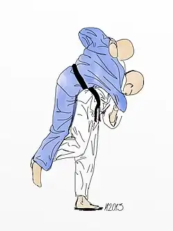 Tori vychýlí ukeho vpravo vpřed, současně přemístí špičku své pravé nohy k jeho pravé noze. Zakročením levou nohou provede tori obrat za stálého tahu obou paží. Zároveň soupeře nadráží pravým bokem a vnější částí stehna. Hod dokončí hlubokým předklonem, přičemž soupeře drží pevně přitisknutého ke svému boku.